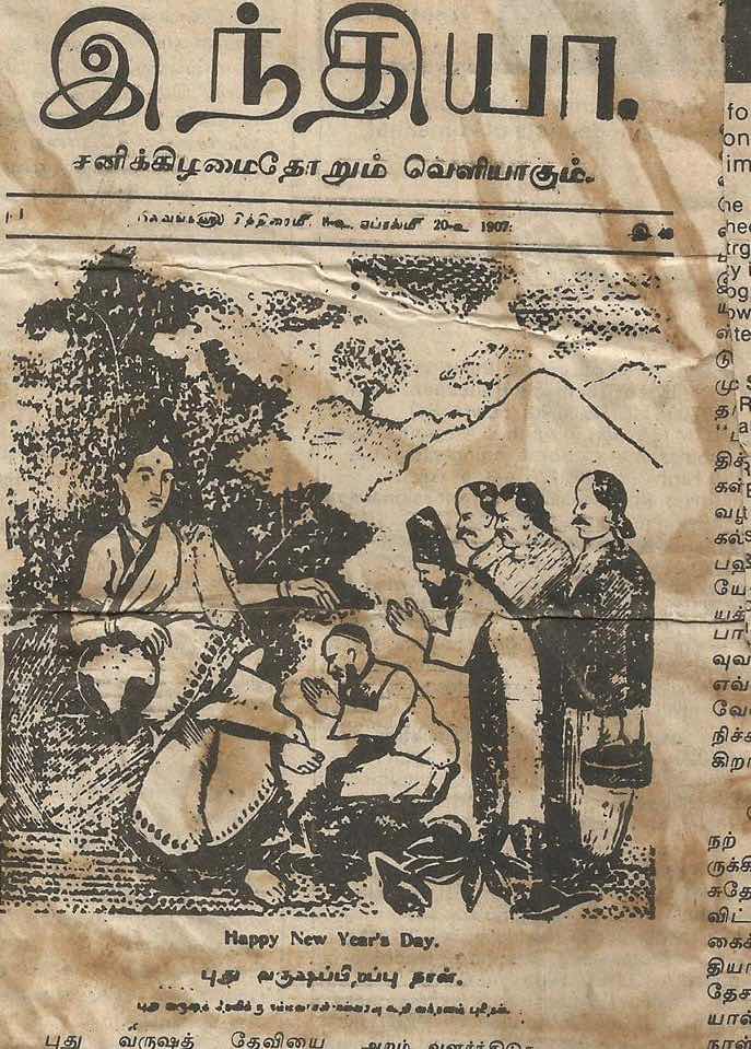 மகாகவி பாரதியார் "இந்தியா" பத்திரிகை நடத்திய போது, அதன் 1907-ஆம் ஆண்டு சித்திரை இதழின் அட்டைப்படச் சித்திரமும், வாசகமும் இன்றும் நமக்கு உகந்ததாக உள்ளது. எல்லா மதத்தினரும் சித்திரை தேவியை வணங்குவதாக அந்த அட்டைப்படத்தை மஹாகவி அமைத்திருந்தார்.