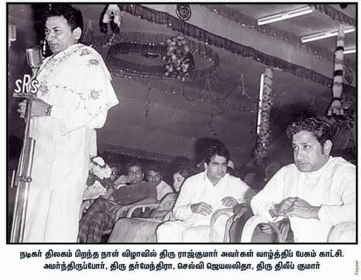 படத்தில், விழாவில் கன்னட சூப்பர் ஸ்டார் ராஜ்குமார் மைக்கில் பேசிக் கொண்டிருக்க, மேடையில் தர்மேந்திரா, ஜெயலலிதா, தீலிப் குமார் மற்றும் நடிகர் திலகம் சிவாஜி கணேசன்.