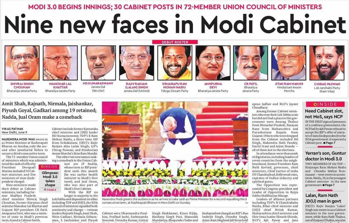 தெரிகிறது. கர்நாடகத்திற்கும் உரிய பிரதிநிதித்துவம் வழங்கப்பட்டிருக்கிறது. இந்த அமைச்சரவையைப் பொறுத்த அளவு எந்த வட்டாரமும் புறக்கணிக்கப்படவில்லை என்பது முக்கியமானது . இப்படி எல்லா மாநிலங்களுக்கான பஞ்சாப் உட்பட பிரதிநிதித்துவம் சரியாக வழங்கப்பட்டிருப்பதாகவே கருதுகிறேன். ஜம்மு-காஷ்மீர் இரண்டிற்கும் தலா ஒரு அமைச்சர் பதவி கொடுக்கப்பட்டிருக்கிறது உத்திரபிரதேசத்தில் போதிய அளவு வெற்றி பெறாவிட்டாலும் கூட அவர்களுக்கு உரிய பிரதிநிதித்துவம் வழங்கப்பட்டிருக்கிறது! எனக்குத் தெரிந்த மூன்று முறை வாரணாசி மிர்ஷாப்பூர் தொகுதியில் வெற்றி பெற்ற ஒரே ஒரு எம்பி ஆன அனுப்பிரியா பட்டேலுக்கும் இந்த முறையும் அமைச்சர் பதவி வழங்கப்பட்டிருக்கிறது. அவர் ஏற்கனவே ராஜாங்கத் துறை மந்திரியாக இருந்தார். இம்முறையும் அதே துறை வழங்கப்பட்டிருக்கிறது. என்று நினைக்கிறேன்.