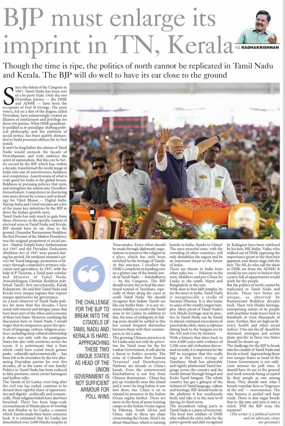 My column published today’s (13-6-2024)The Pioneer ( Delhi edition) BJP must enlarge its imprint in TN, Kerala.