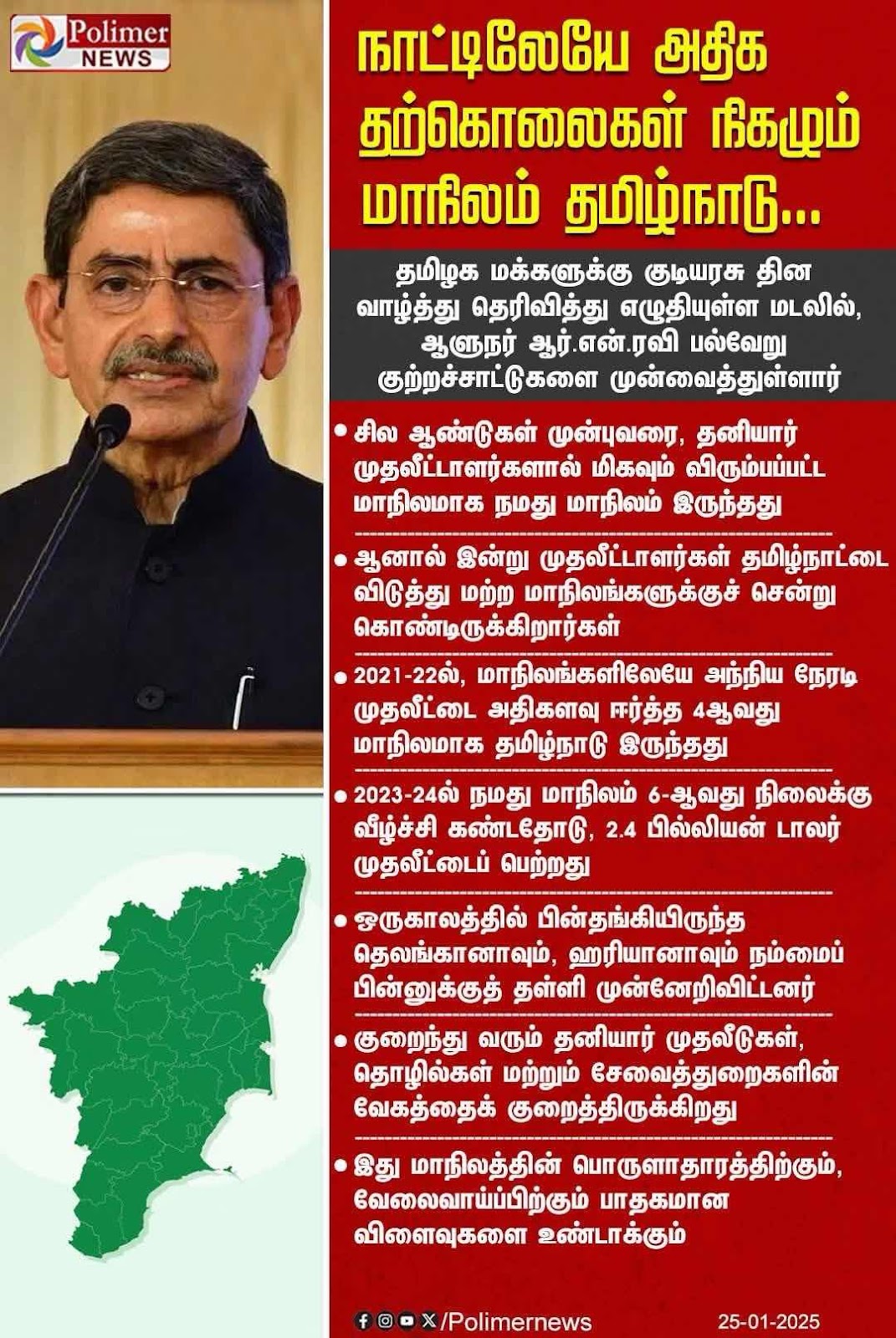 நண்பர்களே, சில ஆண்டுகள் முன்புவரை, தனியார்முதலீட்டாளர்களால் மிகவும் விரும்பப்பட்ட மாநிலமாக நமதுமாநிலம் இருந்தது. ஆனால் இன்று முதலீட்டாளர்கள்தமிழ்நாட்டை விடுத்து மற்ற மாநிலங்களுக்குச் சென்றுகொண்டிருக்கிறார்கள். 2021-22 ஆம் நிதியாண்டில், மாநிலங்களிலேயே அந்நிய நேரடி முதலீட்டை அதிக அளவில்ஈர்த்த 4-ஆவது மாநிலமாக தமிழ்நாடு இருந்ததோடு, 3 பில்லியன்அமெரிக்க டாலர்கள் அளவு முதலீட்டைப் பெற்றது. 2023-24 ஆம்ஆண்டில் நமது மாநிலம் 6-ஆவது நிலைக்கு வீழ்ச்சிகண்டதோடு, 2.4 பில்லியன் அமெரிக்க டாலர்கள் அளவேமுதலீட்டைப் பெற்றது. அதேவேளையில், கர்நாடகம் 6.5 பில்லியன் டாலர் அளவும், குஜராத் 7.3 பில்லியன் டாலர் அளவும், மஹாராஷ்டிரம் 15 பில்லியன் அமெரிக்க டாலர் அளவும்முதலீடுகளை ஈர்த்தன. தெலங்காணாவும், ஹரியாணாவும்ஒருகாலத்தில் நமக்கு அடுத்த நிலையில் இருந்தார்கள்; ஆனால்இப்போது அவர்கள் நம்மைப் பின்னுக்குத் தள்ளிமுன்னேறிவிட்டார்கள். குறைந்து வரும் தனியார் முதலீடுகள், தொழில்கள் மற்றும் சேவைத்துறைகளின் வேகத்தைக்குறைத்திருக்கிறது. இது மாநிலத்தின் பொருளாதாரத்திற்கும், வேலைவாய்ப்பிற்கும் பாதகமான விளைவுகளை உண்டாக்கும். முதலீட்டாளர்களை அச்சுறுத்தும் காரணங்களை நாம்அகற்றியாக வேண்டும்.