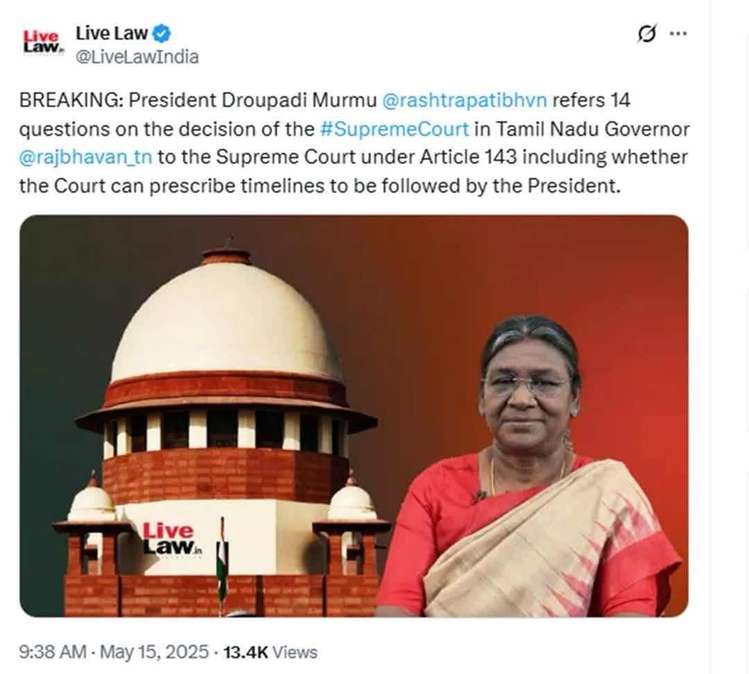 This morning, our President of India, Droupadi Murmu, has sent a query to the Supreme Court under Article 143(1) of the Constitution, asking whether the court can recommend a timeline that the President should follow.