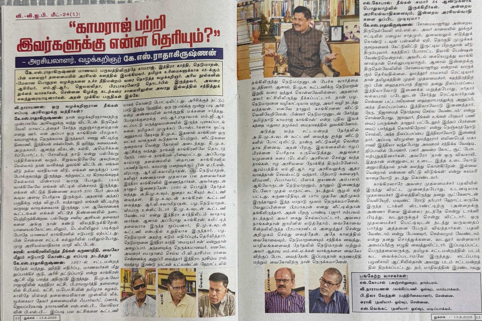 ————————————————————கே.எஸ்.ராதாகிருஷ்ணன் மாணவ பருவத்திலிருந்து காமராஜர், இந்திரா காந்தி, நெடுமாறன் பின் கலைஞர் தலைமையில் 53 ஆண்டுகள் தொடர்ந்து அரசியல் களத்தில் இயங்கியவர். தமிழக உரிமைகளுக்காக 45க்கு மேலான பொது நல வழக்குகளை உச்சநீதி மன்றம் வரை தொடுத்த வழக்கறிஞர். அரிய நூல்களின் ஆசிரியர். எம்ஜிஆர், ஜெயலலிதா, பிரபாகரனோடு தொடர்பில் இருந்தவர். அவரை துக்ளக் வாசகர்கள் சென்னை கிழக்கு கடற்கரை சாலையிலுள்ள அவரது இல்லத்தில் சந்தித்து கலந்துரையாடினார்கள். அதன் முக்கிய பகுதிகள் இங்கே: